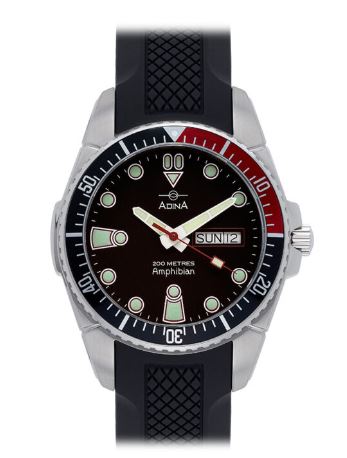 The Adina Amphibian dive watch NK167 P2DXS is robustly constructed from cold stamped, nickel free all stainless steel. This classic divers’ case is armed with its one direction purpose designed black and red bezel houses a fully repairable Swiss Made Ronda movement, in addition is equipped with a sapphire crystal for unparalleled scratch resistance. The Amphibian Collection all being 20ATM water resistant are designed for everyday use including swimming, showering and adventures of almost any kind!