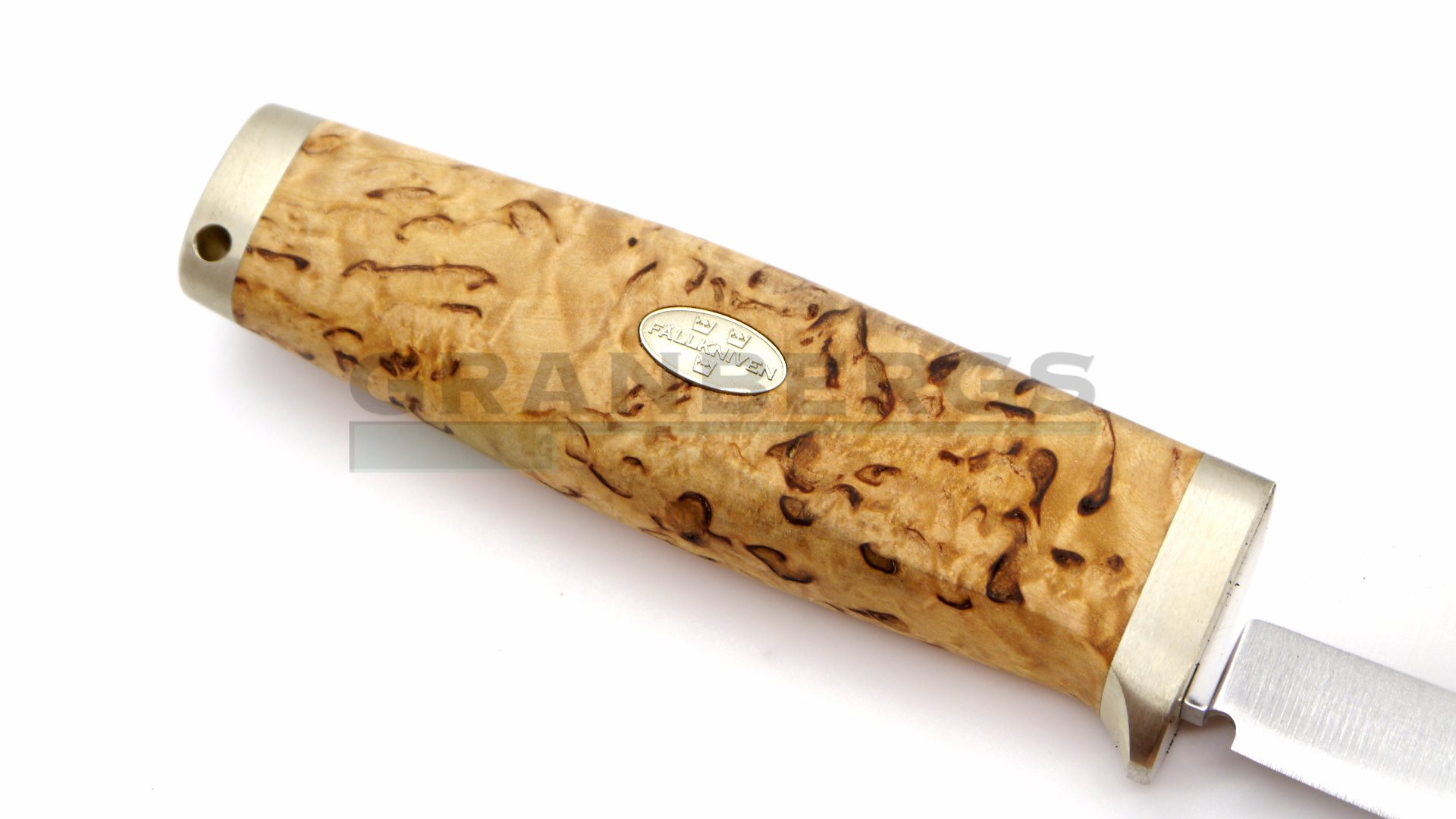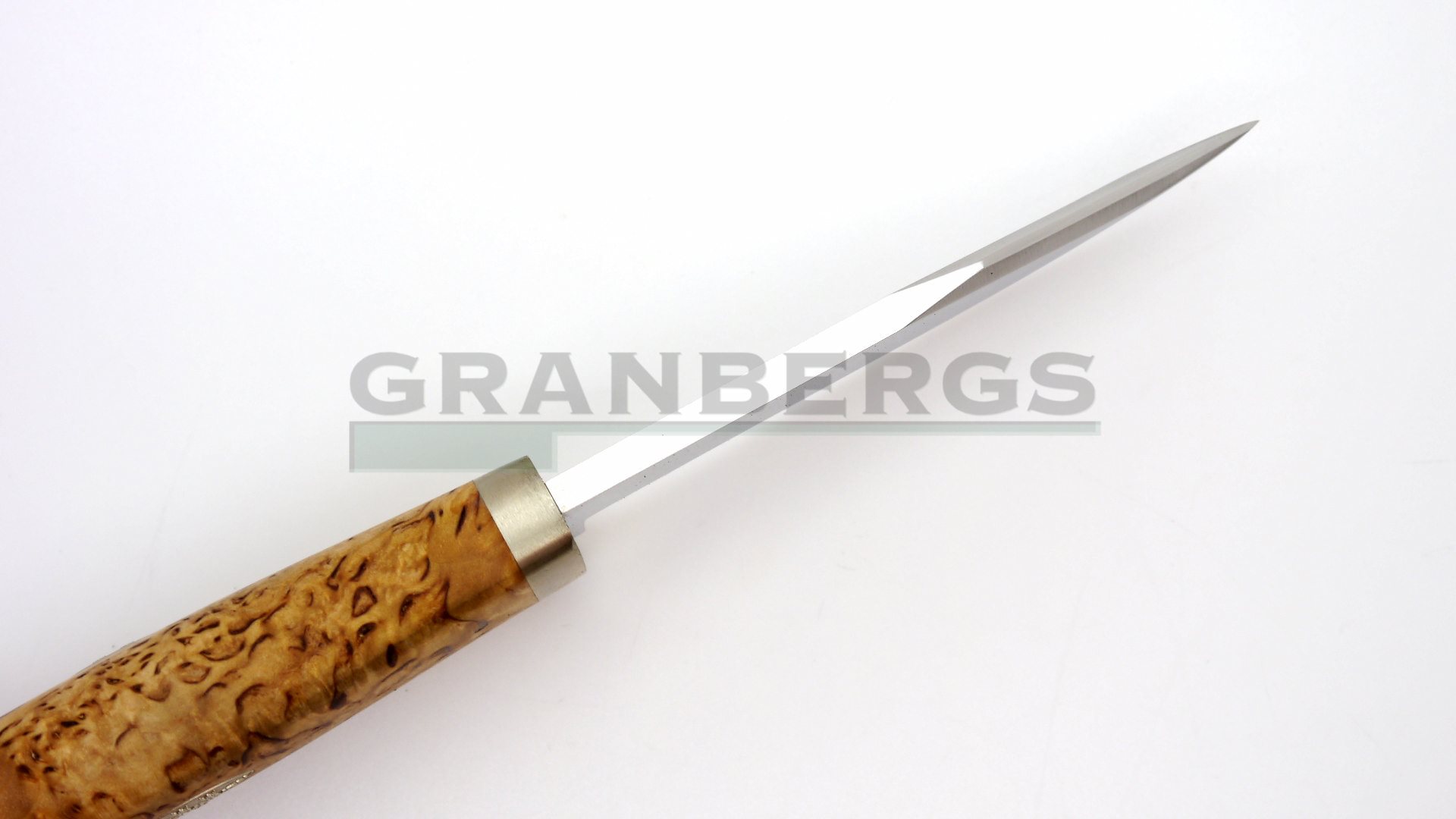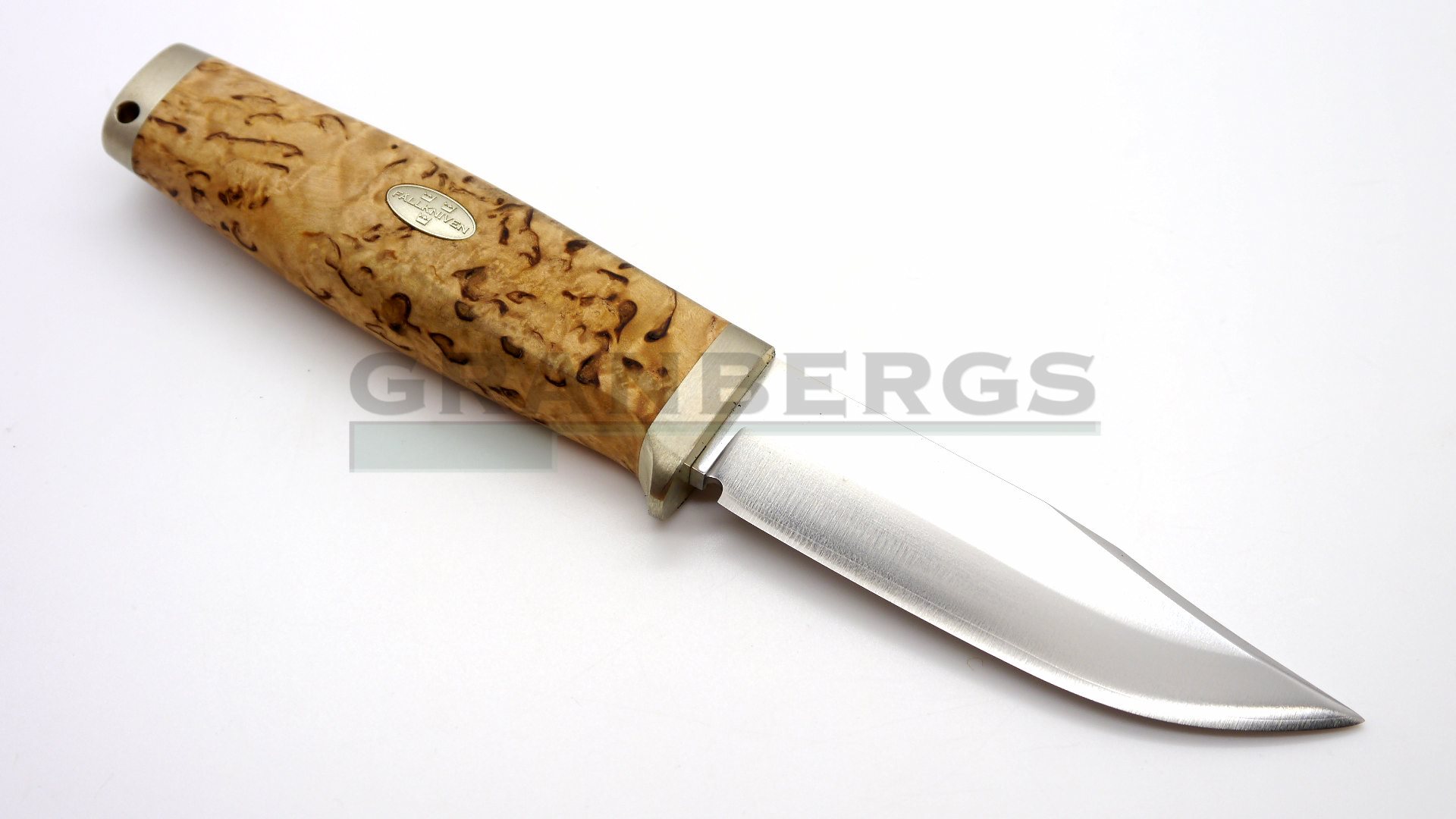 Handle of rich curly birch, solid nickel silver fittings and a sharp blade of laminate powder steel.