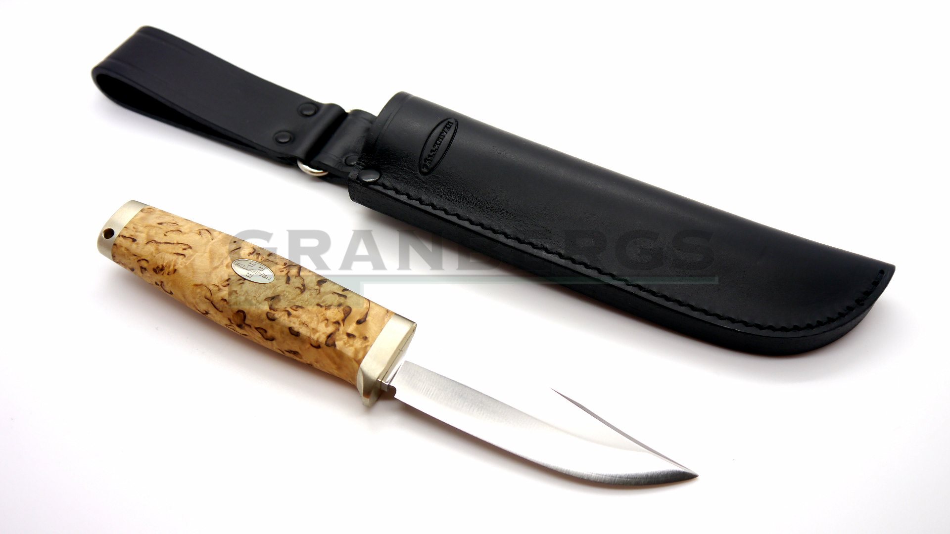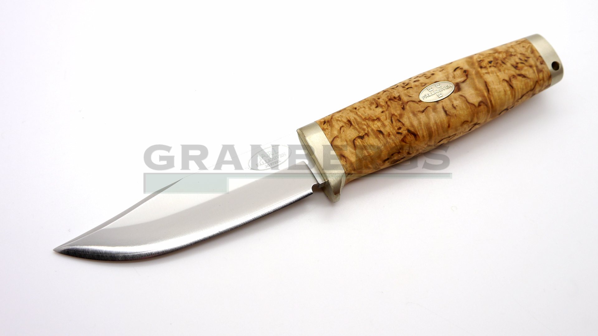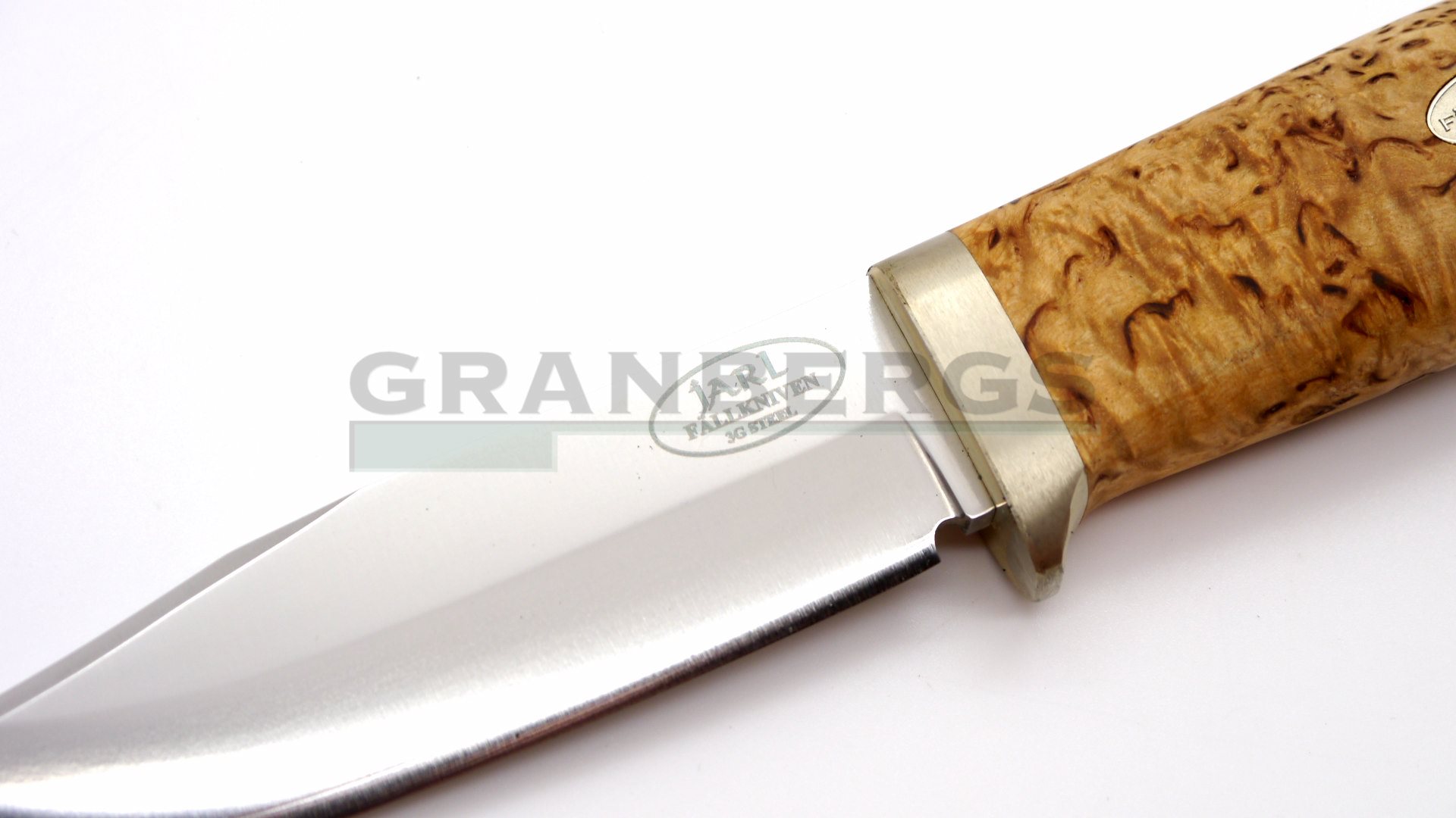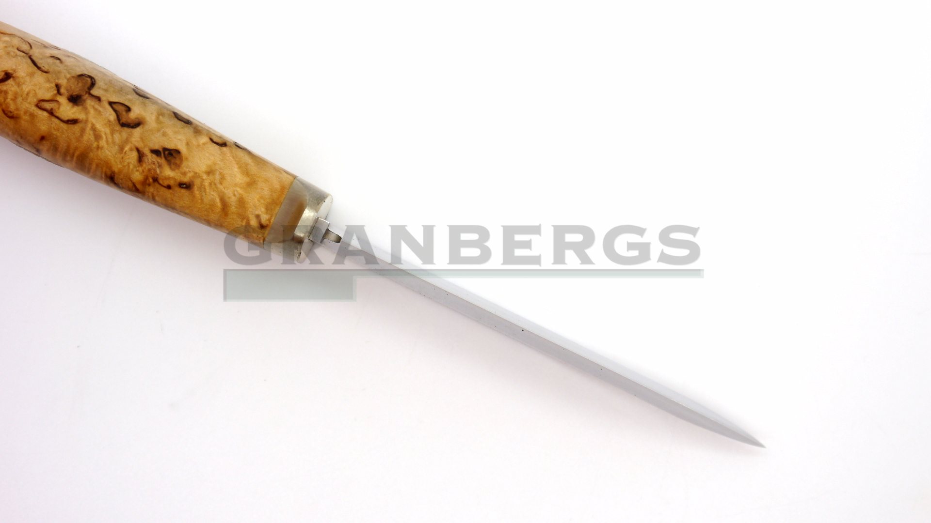 Handle of rich curly birch, solid nickel silver fittings and a sharp blade of laminate powder steel.