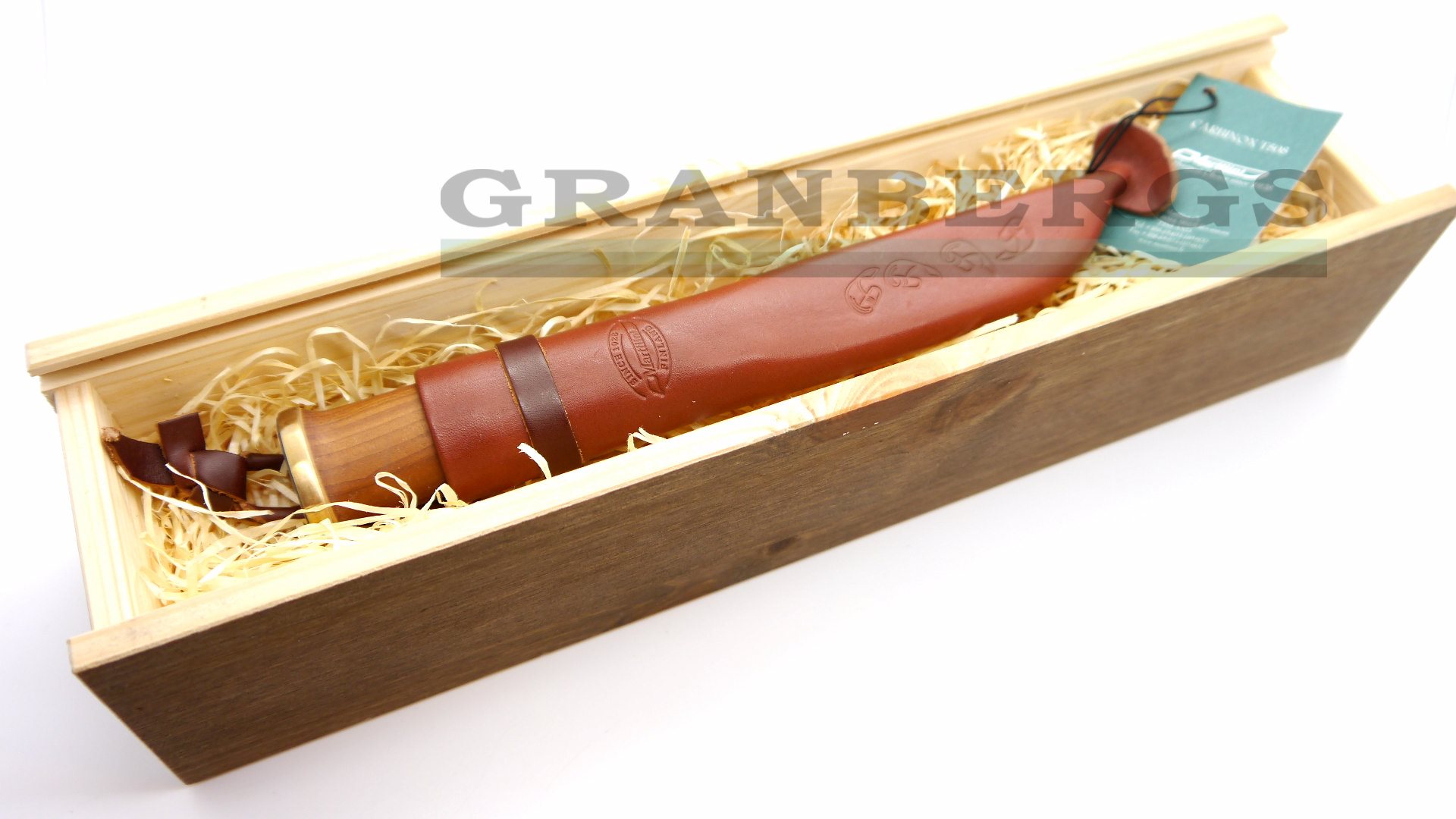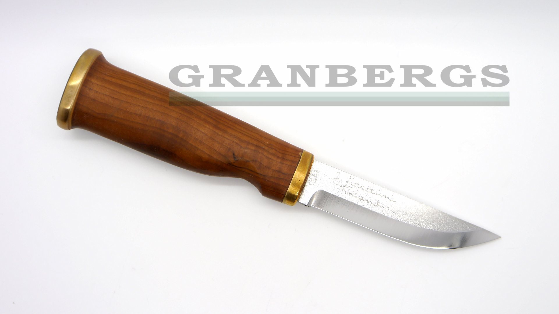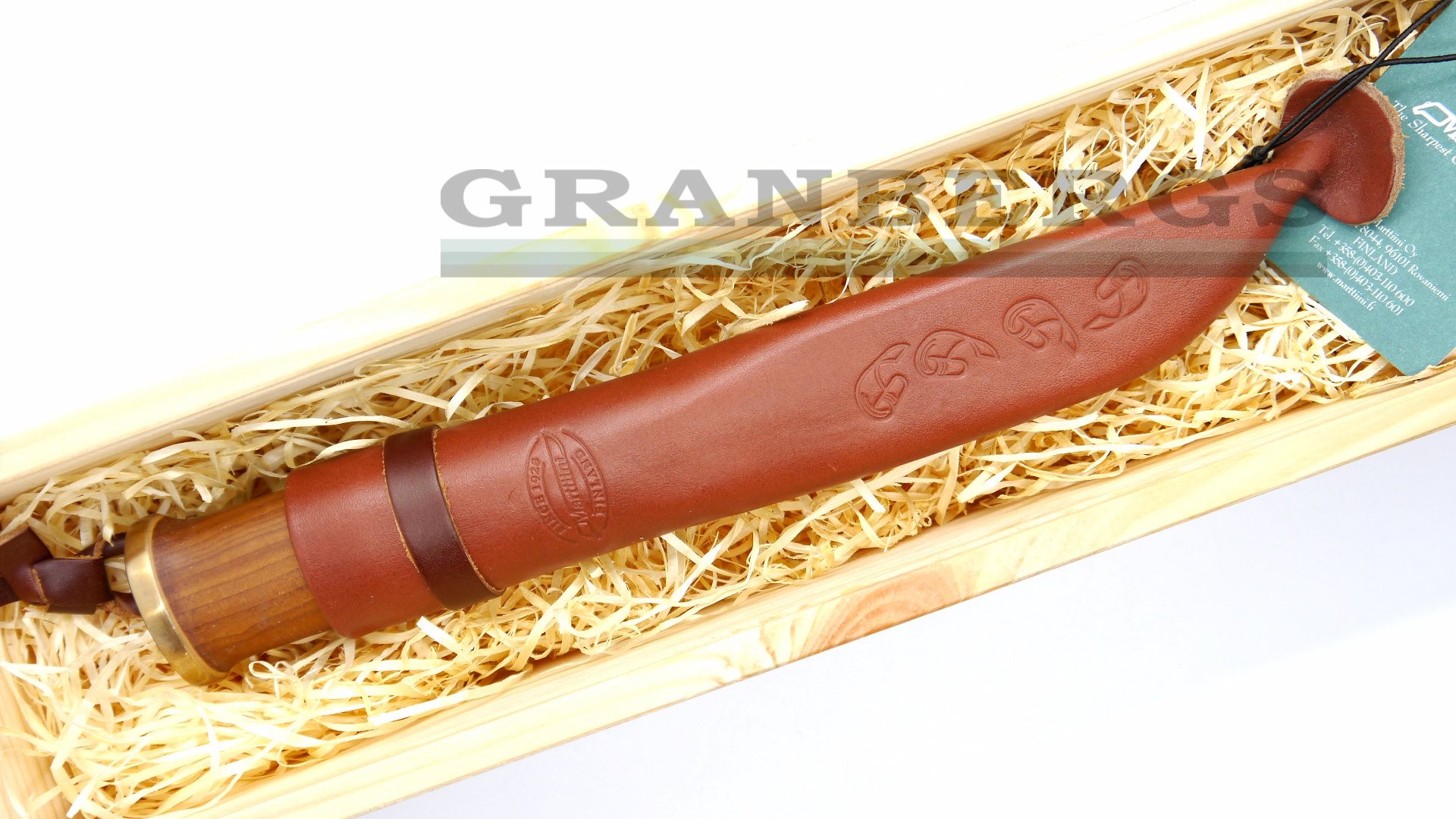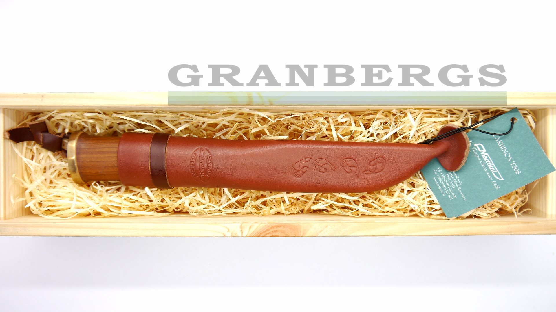 Moose Knife - 7 1/2" overall. 3 1/2" Carbinox T508 steel blade. Blade features "J. Marttiini Finland" signature etch. Heat treated birch handle with cast bronze ferrule and moose engraved bronze pommel. Embossed brown leather belt sheath. Wooden gift box. Weight: 1.2lbs Country of Origin: Finland