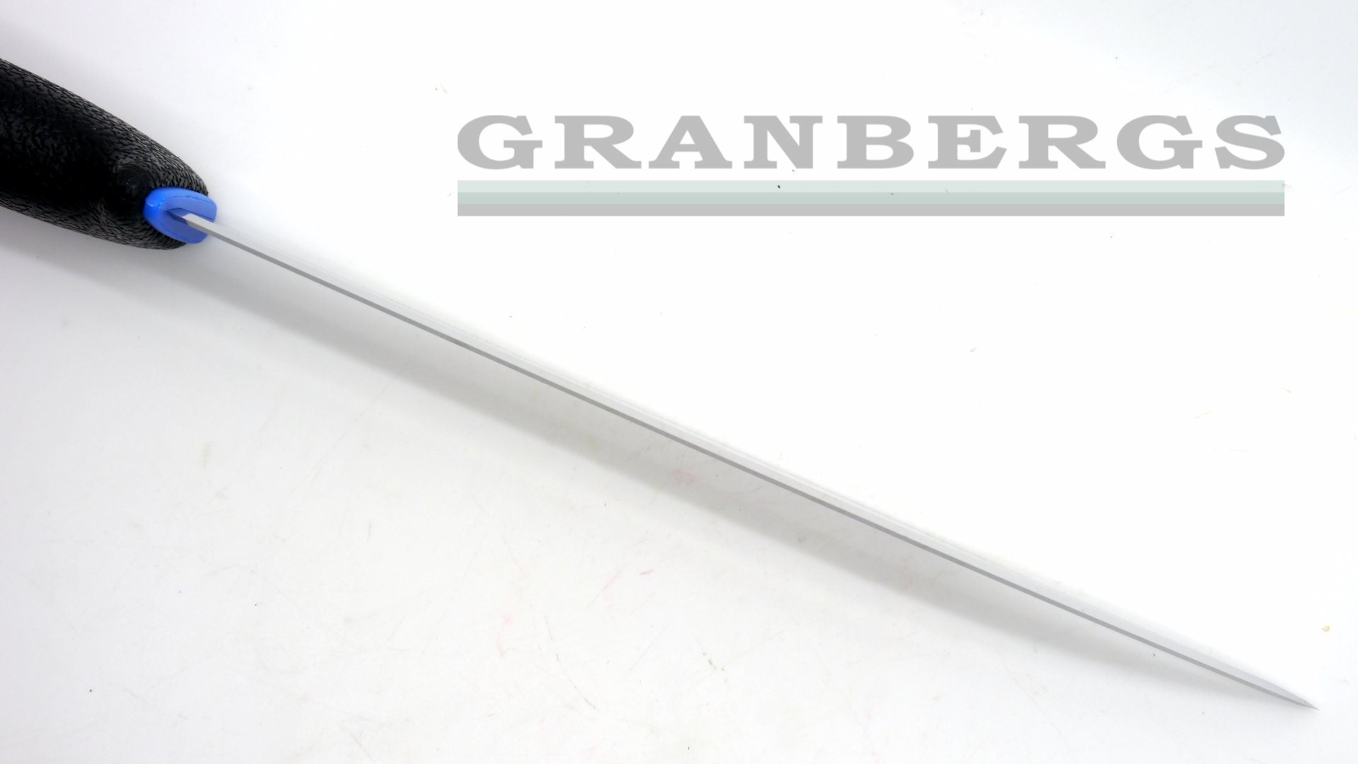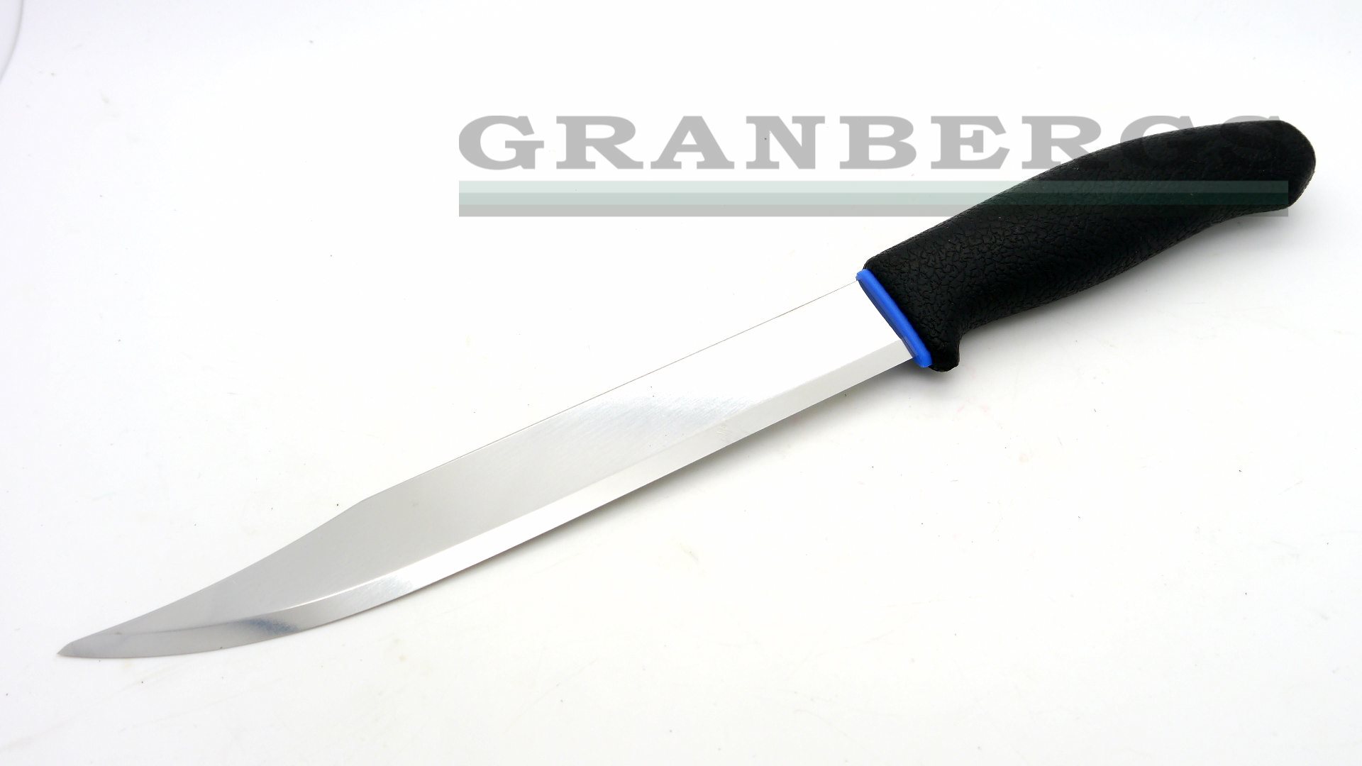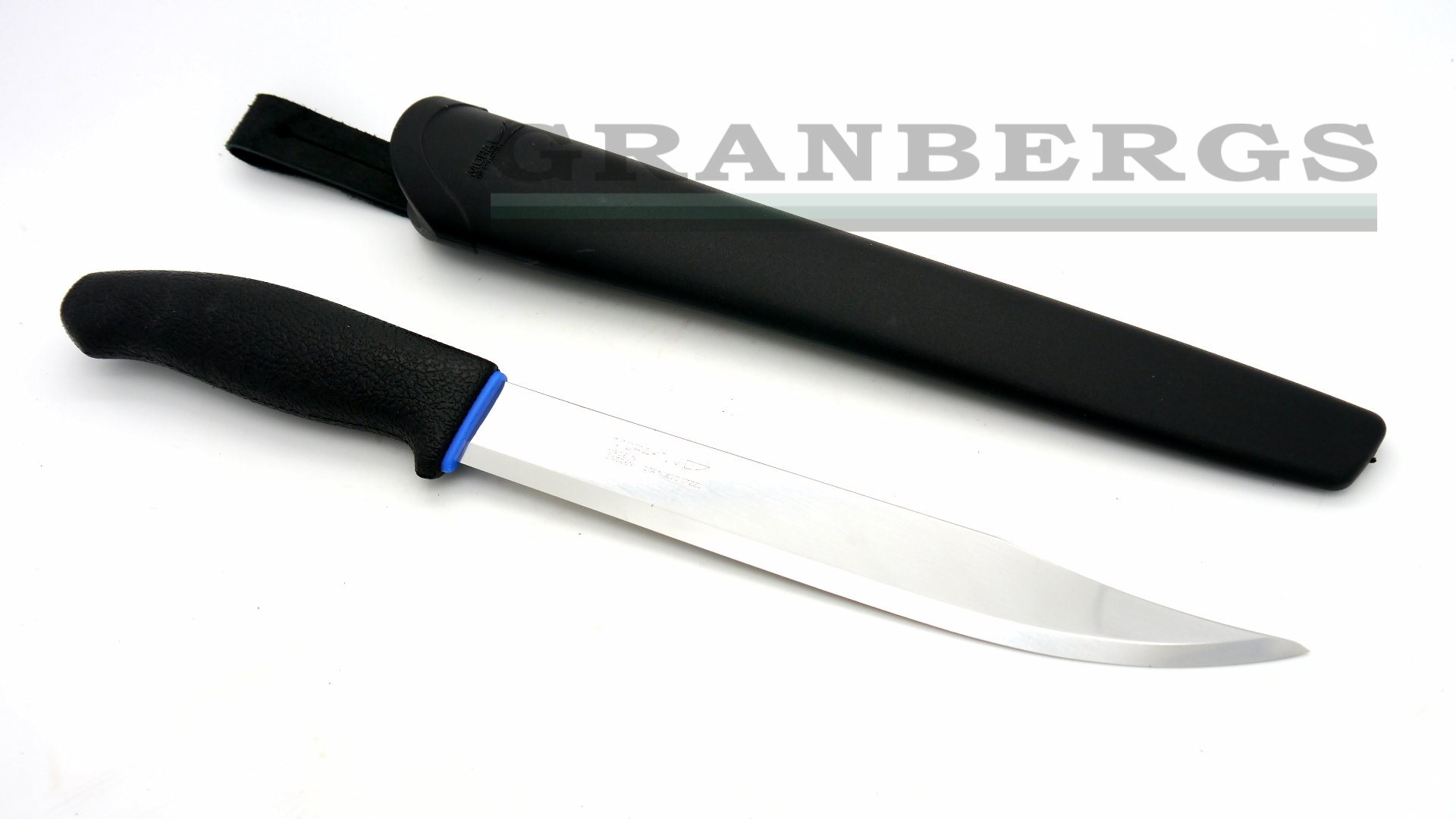 Rubberized, ergonomic black non-slip handle with blue trim. Molded composition belt sheath with water drain hole. An ideal all-in-one knife for outdoor use, especially fishing. Also features an ergonomically designed handle to facilitate work and to help prevent work-related and repetitive strain injuries. Integrated guard offers substantial finger protection.
